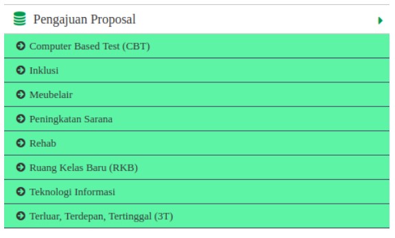 Ada penambahan 3 kategori jenis bantuan pada menu pengajuan proposal, yaitu Computer Based Test (CBT), Teknologi Informasi, dan Terluar, Terdepan, Tertinggal (3T)