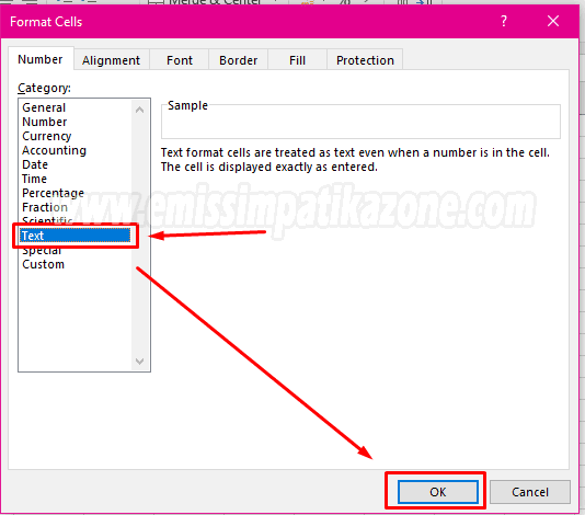 ➧ Tampil menu format cell, Klik TEXT kemudian Klik OK