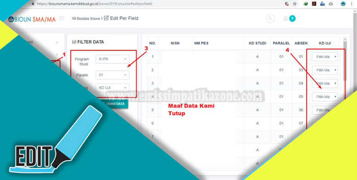 Cara Edit Mapel Di BIOUN SMA / MA / SMK Terbaru – Salah satu hal yang perlu dilakukan dalam pendataan peserta Ujian Nasional pada BIOUN adalah melakukan edit mata pelajaran pada setiap peserta Ujian Nasional. Langkah ini dilakukan setelah sukses mengupload data Identittas Peserta Ujian Nasional.