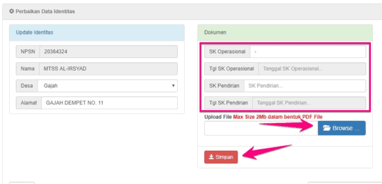 - Setelah itu upload file scan berkas SK Operasional atau SK Pendirian