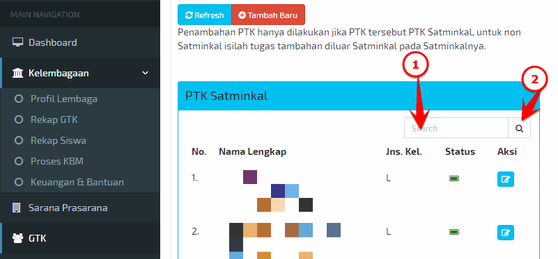 - Maka akan muncul daftar GTK, silahkan cari nama masing – masing atau bisa menggunakan kotak pencarin kemudian klik ikon kaca pembesar