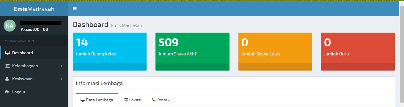 2. Setelah berhasil login, saudara akan berada di menu Dashboard info kondisi umum madrasah.
