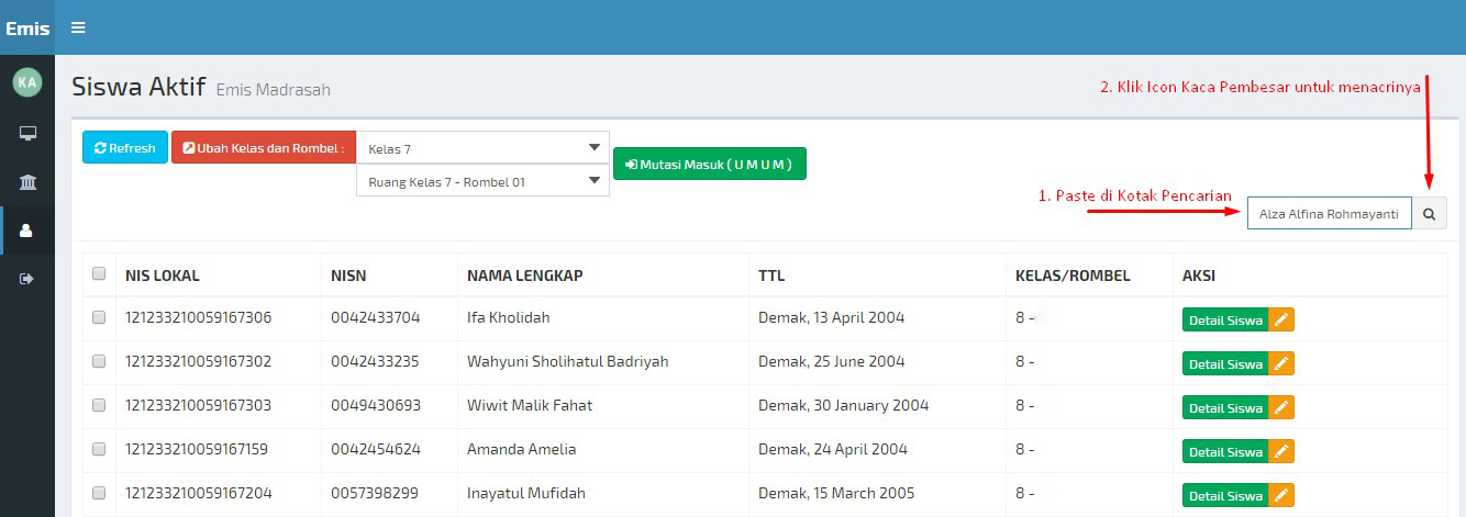 1. Data Siswa sesuai urut Perkelas atau Rombel