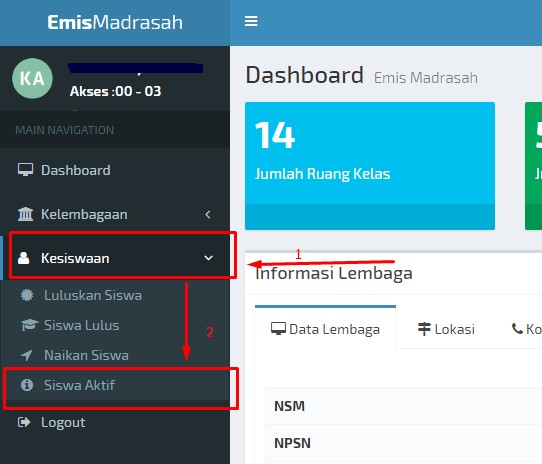 3. Langkah selanjutnya yaitu klik pada menu Kesiswaan. setelah itu klik pada bagian menu Siswa Aktif. Seperti gambar dibawah ini.
