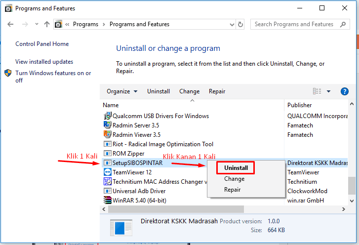 Menghapus terlebih dahulu aplikasi SIBOS PINTAR versi lama harus dilakukan sebelum melakun install aplikasi SIBOS PINTAR Versi Terbaru. Hal ini dilakukan karena menghindari bercampurnya file – file sistem aplikasi SIBOS PINTAR veris lama dengan versi baru. Maka anda wajib menghapus / Uninstall Aplikasi SIBOS PINTAR.