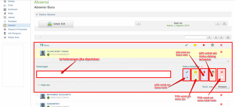 - Untuk mengedit kehadiran, pilih tanggal (sebagai nomor 6 di atas) lalu klik tombol panah ke bawah di ujung kanan nama guru yang bersangkutan.