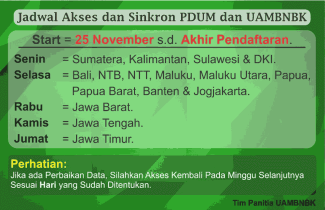Pada tahun ini untuk akses edit dan upload data siswa ke PDUM dilakukan secara roling terjadwal. Jadwal yang diberlakukan berdasarkan zona wilayah. Hal ini dilakukan dengan maksud untuk mengantisipasi Overload yang mengakibatkan web down.