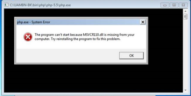 3. File MSVCR110.dll tidak sesuai (Php.exe Error)