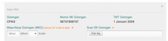 - Khusus bagi PNS akan dimunculkan data golongan, nomor SK Golongan dan TMT golongan. Isikan Masa Kerja Golongan (MKG) dan upload file scan SK Golongan tersebut. Jika data golongan yang ditampilkan tidak sesuai dengan kondisi saat ini, silakan lakukan perubahan data rinci pada menu portofolio ⇒ profil lalu permanenkan dengan mencetak dan mengajukan S12 (Ajuan Perubahan Data) ke admin Simpatika Kab/Kota.
