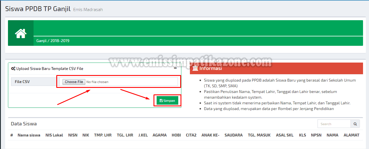 Jika kedua hal diatas sudah anda lakukan maka proses penting yang selanjutnya anda kerjakan adalah Mengupload Form Emis Siswa Baru yang sudah disimpan dalam format CSV ke web emis online 2018/2019.
