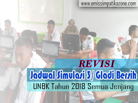 Sejak awal jadwal simulasi sudah diumumkan tanggal pelaksanaanya, tetapi khusus untuk simulasi 3 / Gladi Bersih ini mengalami revisi pelasakanaan. Info revisi jadwal Gladi Bersih / Simulasi 3 disampaikan melalui akun web UNBK dan hanya proktor dan teknisi yang bisa mengakses web UNBK.