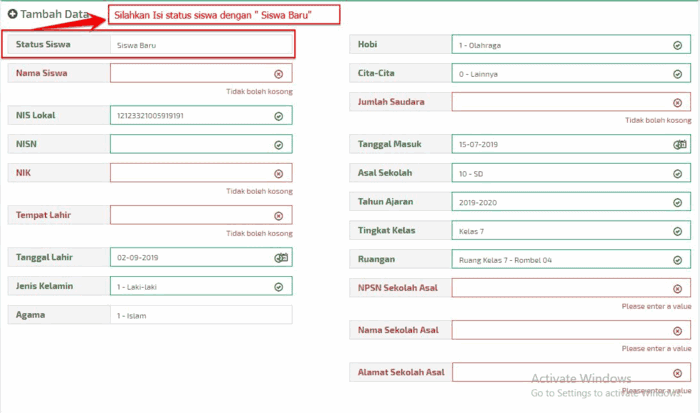 • PENTING ! untuk isis status siswa silahkan isikan dengan “Siswa Baru”. Kemudian untuk data yang lainnya silahkan dilengkapi sesuai kolom yang diminta.
